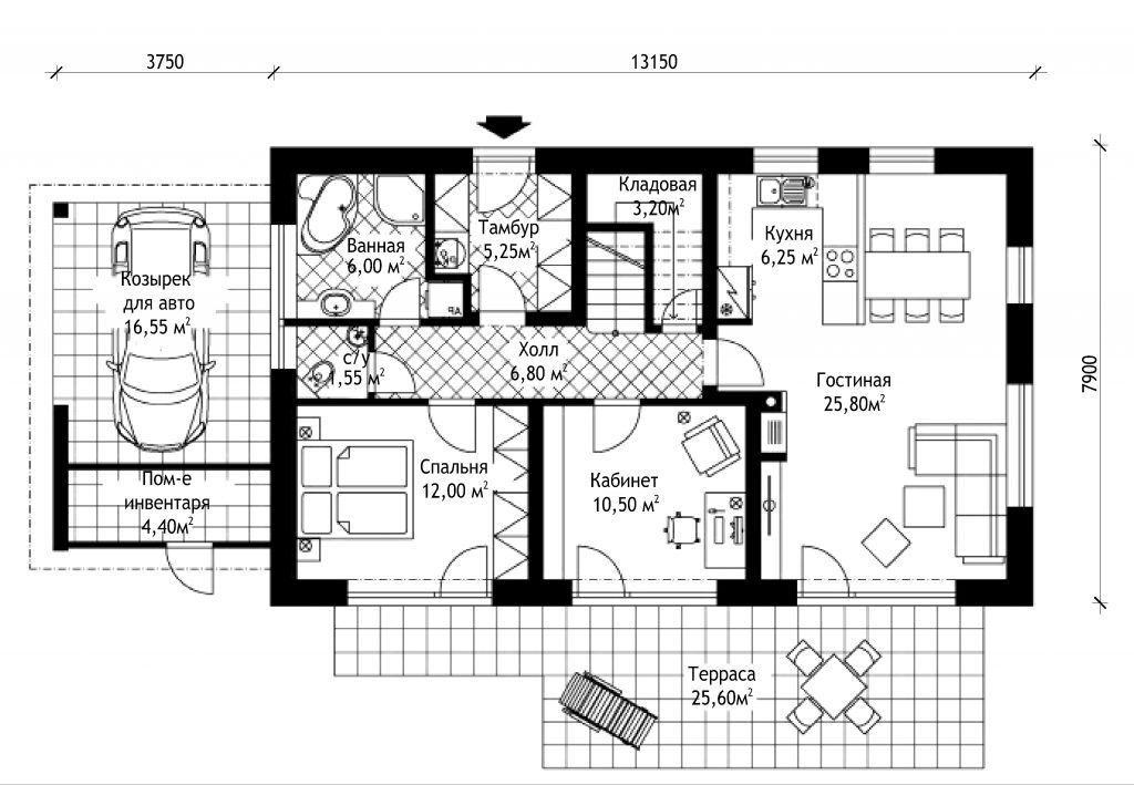 Проект мансардного дома с террасой и навесом S18