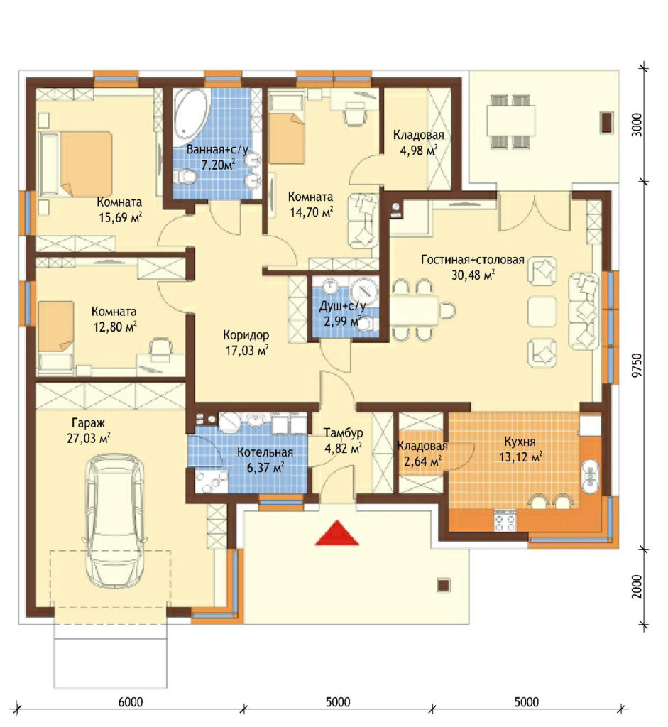 Проект одноэтажного дома с террасой и гаражом P162